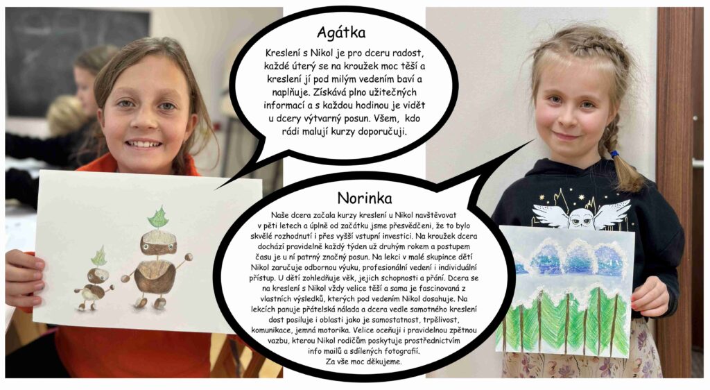 Čím déle se pohybuji ve světe umění, tím více si uvědomuji, že nemohu setrvat jen v roli umělce tvořícího kresby na zakázku. V roce 2017 jsem začala pořádat kurzy pro dospělé “Kreslení pastelkami hrou”, které mají za účel přivést umění i do řad úplně obyčejných lidí, kteří mají touhu naučit se kreslit, ale nikdy nesebrali odvahu, nebo neměli štěstí potkat dobrého učitele. Čím více jsem učila a poslouchala životní příběhy, tím více jsem cítila potřebu začít učit tam, kde strach z kreslení ještě nenastal. Kurzy pro dospělé jsou plné zraněných duší, které někdo od tvoření odradil. A já se ptám proč? Odpověď jsem našla v našem raném věku, kdy nesmí docházet ke škatulkování na ty kdo umí a kdo dostal z výtvarky pětku. Obecně zastávám názor, že by se kreslení nemělo hodnotit známkou, ale tohle člověk bohužel nezmění. Něco ale změnit mohu. Protože jsem sama maminka dvou dětí, vidím obrovský nedostatek učitelů kreslení, kteří by se dětem mohli a hlavně chtěli věnovat. Pokud dítě vyniká talentem, nestačí mu kroužek lepení s papírem. Kde pro něj najít místo, když jsou ZUŠ přeplněné? Od září 2023 jsem se tedy rozhodla začít učit i ty nejmenší. Chci předat své učení dětem, které kreslení opravdu baví.